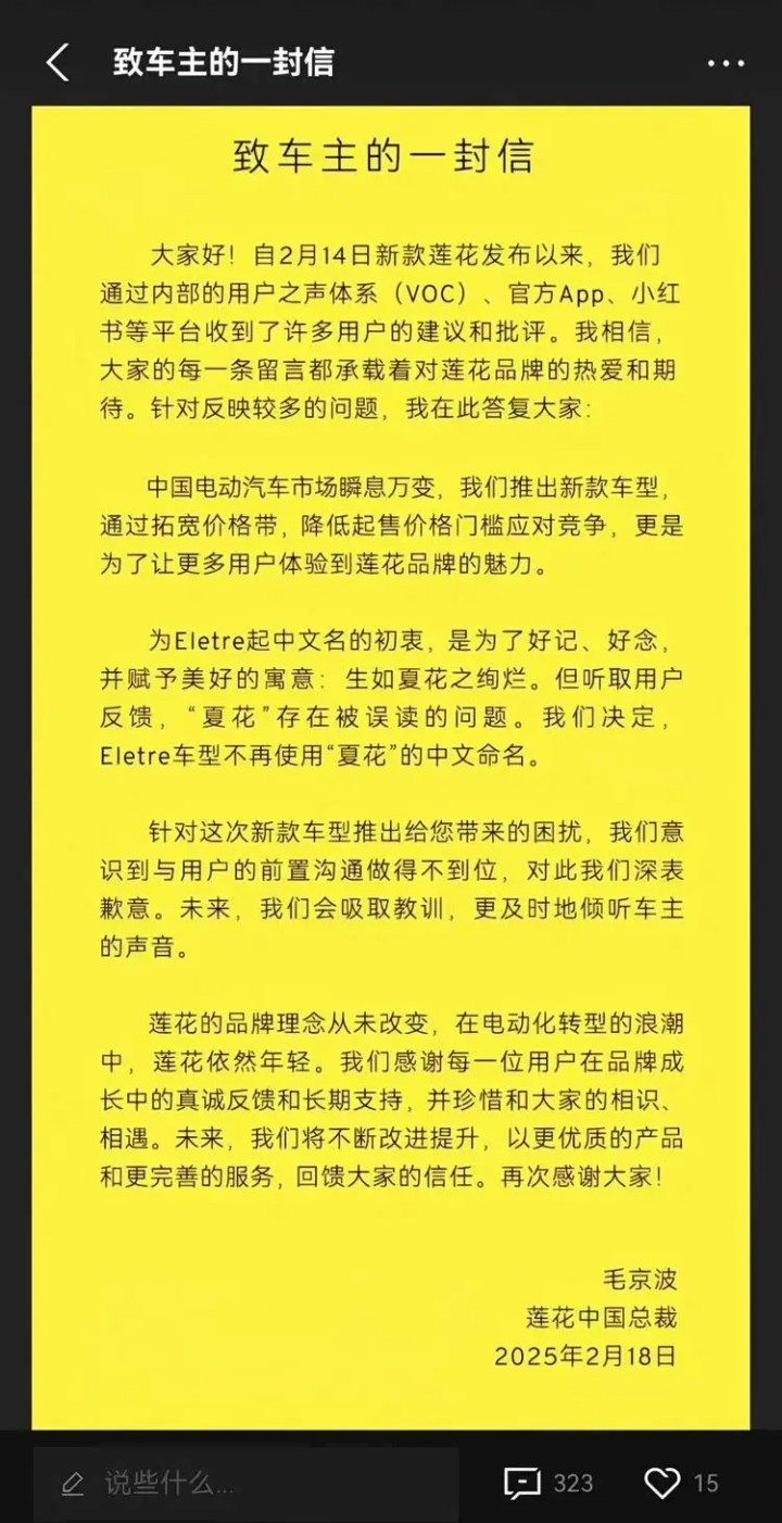 而莲花的遴荐,却是反治其身的大幅降价。2025 年 2 月,上市仅一年的纯电超跑 SUV Eletre(夏花)、纯电四门超跑 Emeya(似锦)开启官降:Eletre 起售价从 72.8 万元降至 54.8 万元,降幅达 18 万元;Emeya 起售价从 66.8 万元降至 52.8 万元,降幅 14 万元。这一操作径直 “背刺” 老车主,激励大面积动怒,最终中国区总裁毛京波箭在弦上布致歉信安抚用户。降价后,莲花 2024 年中国销量虽有小幅增长,但全年仅 1.2 万辆的获利。更致命的是,50 万元级的价钱区间,让莲花透彻脱离了超豪华阵营,沦为与极氪、小米,蔚来等品牌高端车型径直缠斗的 “价钱战选手”,品牌溢价化为乌有。