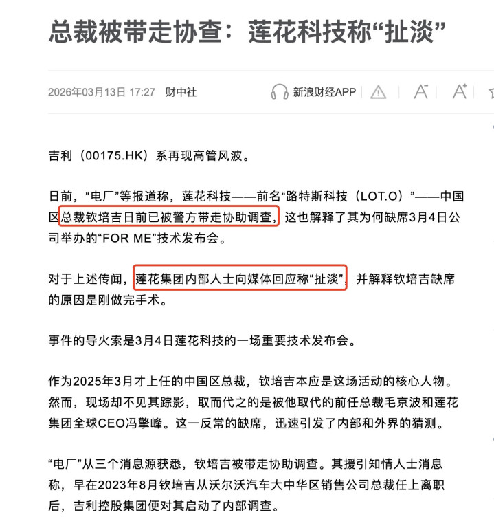 临了,连稳固的处治团队,莲花也未能守住。近期《财中社》等媒体报谈,莲花科技中国区总裁钦培吉疑似被带走协助拜谒,尽管品牌里面东谈主士以 “扯淡” 回话,并解释其缺席 3 月 4 日 For Me 本事发布会的原因是 “刚作念完手术”,但中枢高管在要道发布会缺席、传奇满天飞的景况,已激励市集对品牌处治稳固性的热烈质疑。为何偏巧是莲花,在新本事发布的进攻节点,堕入高管风云?这背后反应的,省略是品牌里面处治的弘大与隐患。