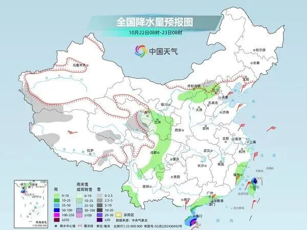 24日,西藏东部、青海东部和南部、甘肃南部、川西高原北部等地部分地区有中到大雪,局地暴雪(10~15毫米);内蒙古河套地区、西藏东部和南部、西北地区东部、华北南部、黄淮西部、西南地区东部、台湾岛等地部分地区有小雨,其中,台湾岛北部和东部等地部分地区有中到大雨,局地暴雨。
