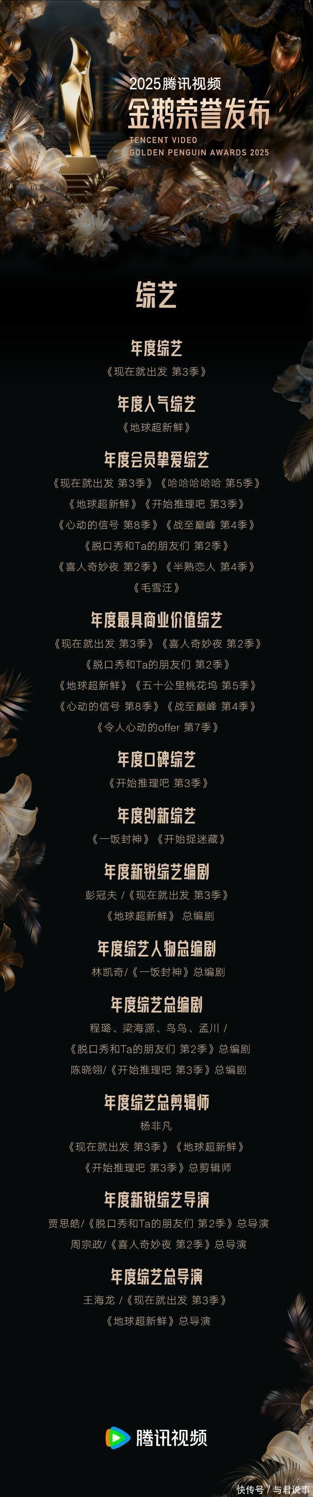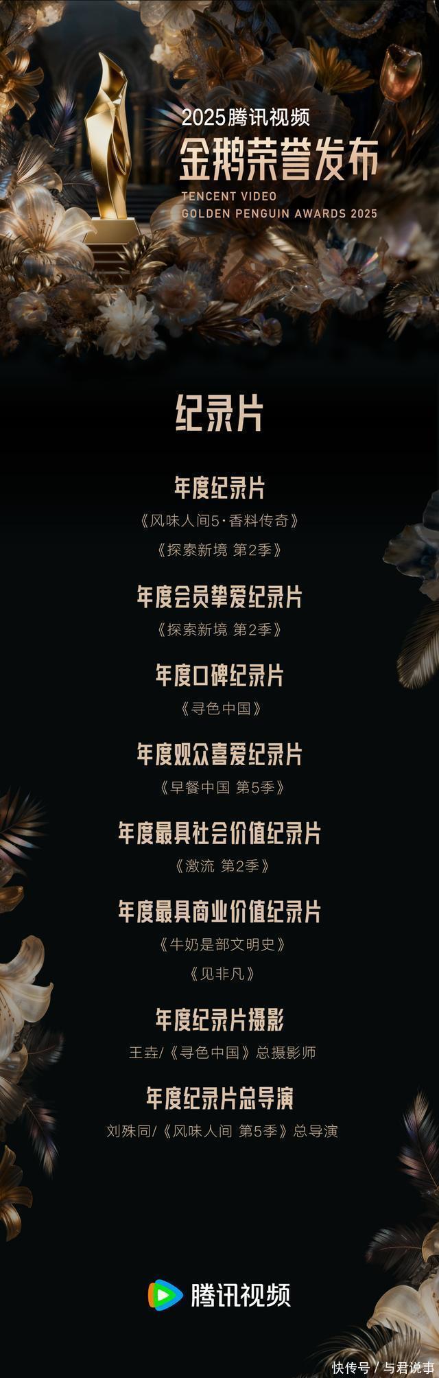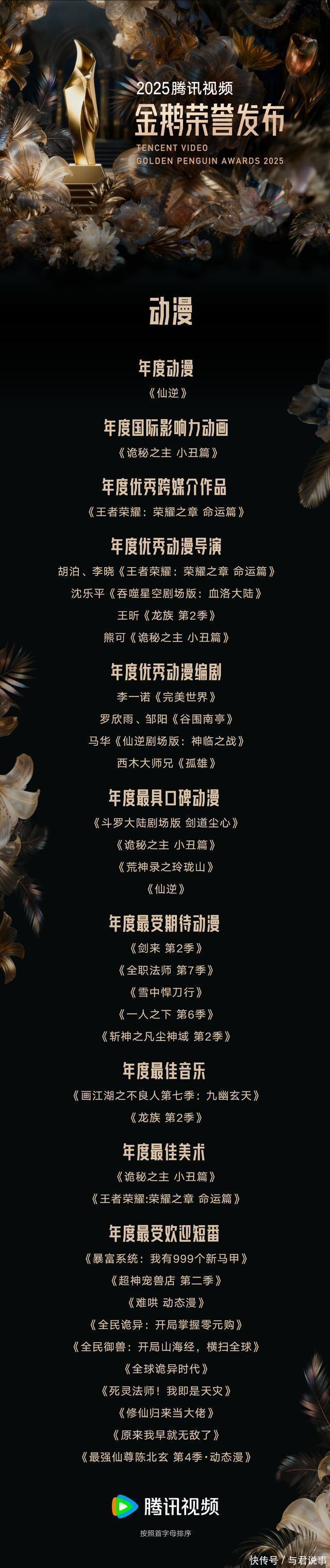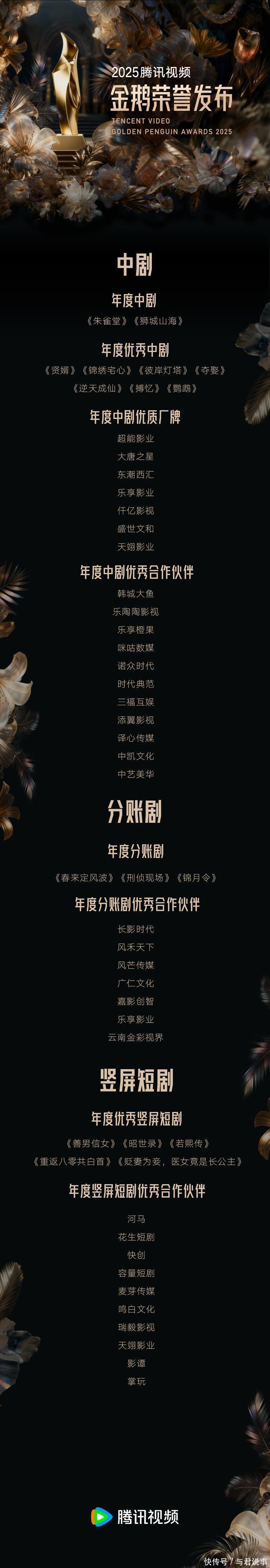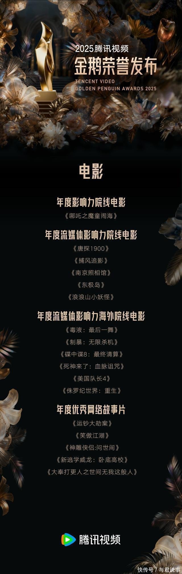 剧集方面,《六姊妹》《扫毒风暴》《繁花》《四喜》《枭起青壤》《锦月如歌》《利剑·玫瑰》《狙击蝴蝶》《长安的荔枝》《棋士》《无限的至极》《吴邪私家札记》荣获年度优秀剧集;《许我详确》《大奉击柝东说念主》《俯首》《扫毒风暴》《雁回时》《狙击蝴蝶》《枭起青壤》《吴邪私家札记》《棋士》《六姊妹》《长安的荔枝》《子夜归》荣获年度会员挚爱剧集;《余生有涯》《芬芳喜事》荣获年度单位剧集;《棋士》荣获年度X戏院剧集;《长安的荔枝》荣获年度IP升值剧集;《归队》《无限的至极》荣获年度实验见地优秀剧集;《无限的至极》荣获年度口碑剧集;《许我详确》《雁回时》《大奉击柝东说念主》《俯首》荣获年度爆款剧集;《许我详确》荣获年度剧集。 综艺方面,《当今就起程第3季》荣获年度综艺;《地球超崭新》荣获年度东说念主气综艺;《当今就起程第3季》《哈哈哈哈哈第5季》《地球超崭新》《驱动推理吧第3季》《心动的信号第8季》《战至巅峰第4季》《脱口秀和Ta的一又友们第2季》《喜东说念主奇妙夜第2季》《半熟恋东说念主第4季》《毛雪汪》荣获年度会员挚爱综艺;《当今就起程第3季》《喜东说念主奇妙夜第2季》《脱口秀和Ta的一又友们第2季》《地球超崭新》《五十公里桃花坞第5季》《心动的信号第8季》《战至巅峰第4季》《令东说念主心动的offer第7季》荣获年度最具交易价值综艺;《驱动推理吧第3季》荣获年度口碑综艺;《一饭封神》《驱动捉迷藏》荣获年度立异综艺。 动漫方面,《仙逆》荣获年度动漫;《机要之主懦夫篇》荣获年度国际影响力动画;《王者荣耀:荣耀之章运说念篇》荣获年度优秀跨绪言作品;《斗罗大陆戏院版剑说念尘心》《机要之主懦夫篇》《荒神录之玲珑山》《仙逆》荣获年度最具口碑动漫;《剑来第2季》《全职法师第7季》《雪中悍刀行》《一东说念主之劣等6季》《斩神之凡尘神域第2季》荣获年度最受期待动漫;《画江湖之不良东说念主第七季:九幽玄天》《龙族第2季》荣获年度最好音乐;《机要之主懦夫篇》《王者荣耀:荣耀之章运说念篇》荣获年度最好好意思术;《暴富系统:我有999个新马甲》《超神宠兽店第二季》《难哄动态漫》《全民诡异:开局掌抓零元购》《全民御兽:开局山海经,横扫人人》《人人诡异期间》《死灵法师!我就是天灾》《修仙归来当大佬》《蓝本我早就无敌了》《最强仙尊陈北玄第4季·动态漫》荣获年度最受接待短番。 电影方面,《哪吒之魔童闹海》荣获年度影响力院线电影;《唐探1900》《捕风追影》《南京摄影馆》《东极岛》《浪浪山小妖魔》荣获年度流媒体影响力院线电影;《毒液:临了一舞》《制暴:无限杀机》《碟中谍8:最终算帐》《死神来了:血脉丧祭》《好意思国队长4》《侏罗纪天下:腾达》荣获年度流媒体影响力外洋院线电影;《运钞大劫案》《笑傲江湖》《神雕侠侣:问世间》《新逃学威龙:卧底高校》《大奉击柝东说念主之世间无我这般东说念主》荣获年度优秀网罗故事片。 中剧方面,《朱雀堂》《狮城山海》荣获年度中剧;《贤婿》《锦绣用意》《此岸灯塔》《夺娶》《逆天羽化》《搏忆》《鹦鹉》荣获年度优秀中剧。分账剧方面,《春来定风云》《刑侦现场》《锦月令》荣获年度分账剧。竖屏短剧方面,《善男善女》《昭世录》《若熙传》《重返八零共鹤发》《贬妻为妾,医女竟是长公主》荣获年度优秀竖屏短剧。 记载片方面,《风范东说念主间5·香料外传》《探索新境第2季》荣获年度记载片;《探索新境第2季》荣获年度会员挚爱记载片;《寻色中国》荣获年度口碑记载片;《早餐中国第5季》荣获年度不雅众醉心记载片;《急流第2季》荣获年度最具社会价值记载片;《牛奶是部时髦史》《见超卓》荣获年度最具交易价值记载片。 跨绪言单位中,《王者荣耀:荣耀之章运说念篇》荣获年度优秀跨绪言作品;《王者荣耀》荣获年度跨绪言优秀IP。少儿方面,《我的同学是好意思东说念主鱼2》《动物神探队2》荣获年度优秀少儿动画片。AI单位中,《带我去飞》荣获年度AI电影;《机械心与狗尾巴》荣获年度AI短片;《兴安岭诡事》荣获年度AI短剧;《新天下加载中》荣获年度AI短番。