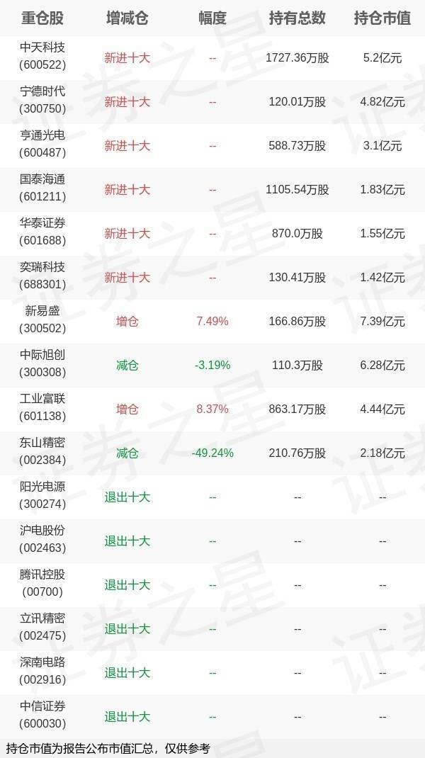 证券之星讯息,4月22日易方达基金旗下刘健维处置的易方达科融搀和型基金公布一季报,近1年净值增长率165.47%。与上一季度比拟,该基金前十大重仓股新增中天科技,宁德期间,亨通光电,国泰海通,华泰证券,奕瑞科技;并对新易盛增仓11.62万股,为该基金第一大重仓股;阳光电源,沪电股份,腾讯控股,立讯精密,深南电路,中信证券等退出前十大重仓股;瞩目数据如下: